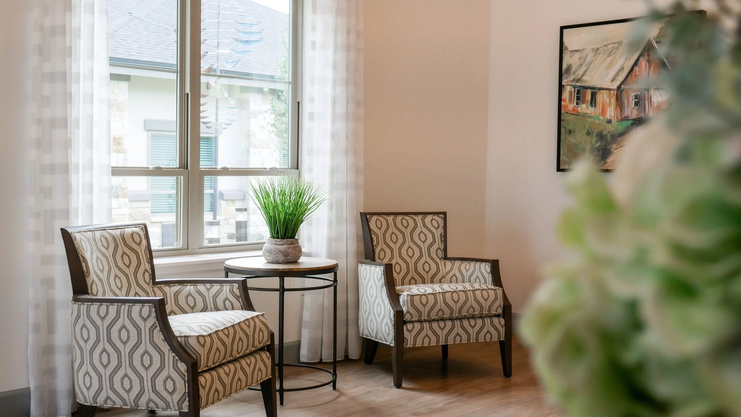 Sage Valley features a modern farmhouse concept. Dark stained wood and light neutral paint colors give this project a modern, sleek look, while the use of wooden ceiling beams and stone fireplaces brings in that rustic Texas feel. High ceilings with statement light fixtures help give this building a grand feeling as you are walking through the space. Local Texas-themed photography is featured throughout the building to bring the surrounding community inside the building.